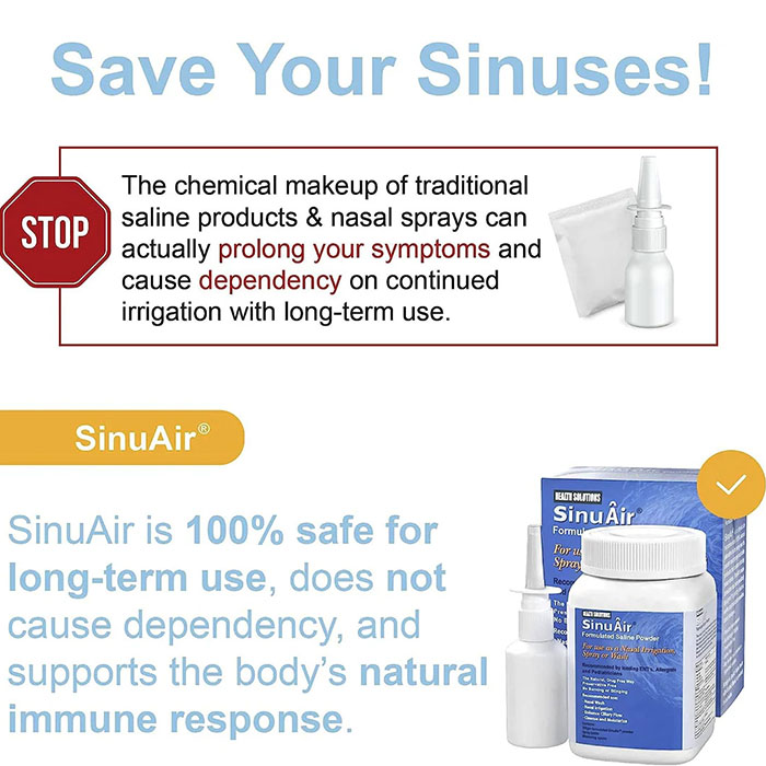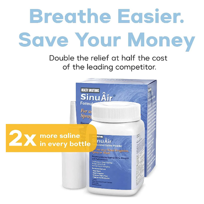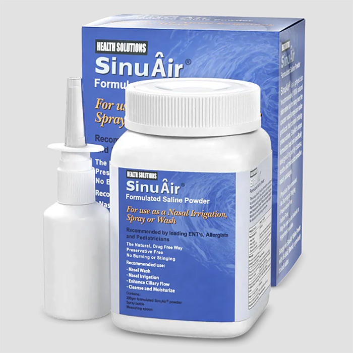 Muối pha SinuAir® là thương hiệu muối pha cao cấp được bảo hộ của tập đoàn Health Solutions Medical Products Corp ở California, Mỹ. Muối chứa 4 thành phần muối và đã được chứng minh là mang lại rất nhiều lợi ích cho việc rửa mũi xoang, tăng cường sức khỏe hệ thống mũi xoang, tăng cường hoạt động của hệ thống miễn dịch của cơ thể và giảm sự phụ thuộc vào việc rửa mũi để duy trì đường mũi xoang khỏe mạnh.