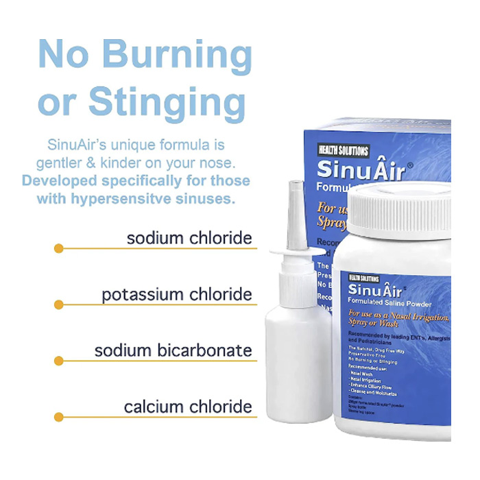 Công thức muối pha SinuAir ® chứa các hợp chất muối kali và canxi, là các thành phần tự nhiên được tìm thấy trong nước đại dương và trong chất dịch cơ thể của con người. Nước muối pha này mang lại lợi ích làm sạch và sự thoải mái tối đa khi rửa mũi.