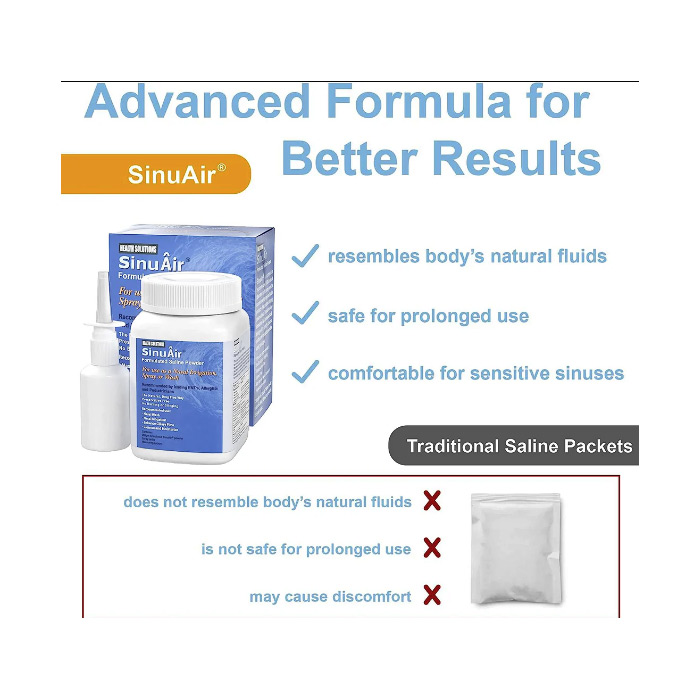 Muối pha SinuAir được sử dụng cùng với máy rửa mũi xoang SinuPulse Elite (máy cắm điện), Traveler (máy cầm tay) và tất cả các sản phẩm rửa mũi khác trên thị trường. SinuAir được thiết kế để làm sạch, làm dịu và giữ ẩm cho đường mũi nhạy cảm, đồng thời giúp giảm bớt các triệu chứng xoang và dị ứng. Hầu hết các dung dịch muối pha rửa mũi trên thị trường chỉ chứa 1 thành phần (natri clorua) hoặc 2 thành phần (natri clorua và baking soda) trong khi muối SinuAir có chứa 4 thành pầnmuối. SinuAir là một công thức nước muối tăng cường có chứa thêm các hợp chất muối kali và canxi, là các thành phần tự nhiên được tìm thấy trong đại dương và chất dịch cơ thể của chúng ta. Công thức muối tăng cường này mang lại lợi ích làm sạch và thoải mái tối đa khi người dùng rửa mũi.